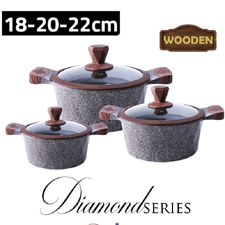 6 پارچه گرانیتی سه قابلمه به سه درب ضد خش، ساییدگی و حریق درب پیرکس با دریچه بخار مخفی دستگیره چوبی و دمکن سیلیکونی