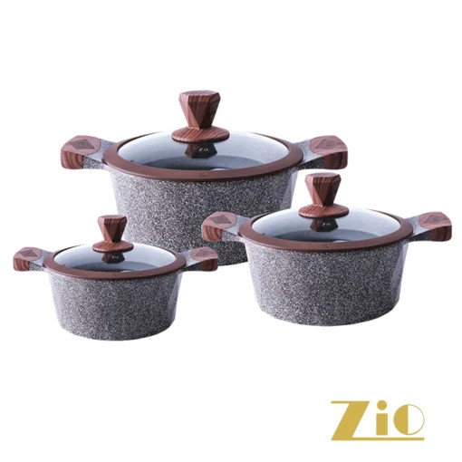 سرویس قابلمه 6 پارچه زیو مدل Zio 8170-22 در دو رنگ چوبی و مشکی. سه ظرف در سایز 18، 20 و 22 سانتی متر مناسب برای خانوار کم جمعیت و جهاز عروس. بدنه گرانیتی طرح شنی بسیار مستحکم و نسوز. قادر به تحمل دمایی بسیار بالا همچنین روکش فاقد مواد سرطان زا و نچسب. سطح داخلی و بیرونی کاملاً ضد خش هستند و با اجسام نوک تیز و زبر دچار خط و خش نخواهند شد.درای سه عدد درب پیرکس نشکن مجهز به نوارد سیلیکونی است اهمیت وجود نوار سیلیکونی در کاهش اصطکاک شیشه با بدنه همچنین استفاده به عنوان دمکنی است سرویس قابلمه گرانیتی زیو ترکیه مجهز به دستگیره های چوبی در دو طرف ظروف است. تمام درب های شیشه ای نیز دارای دستگیره چوبی هستند.