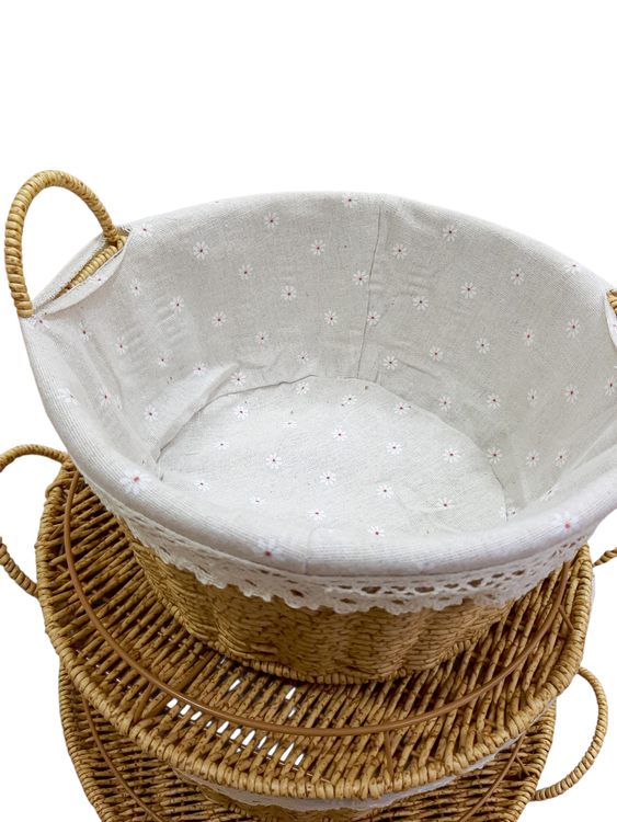 ست سهتایی سبد حصیری دربدار ترکیبی از زیبایی طبیعی، دوام بالا و طراحی ظریف است. این سبدها با ظاهری کلاسیک و تزیین نوار پارچهای با لبهی دانتلی، جلوهای گرم و دلنشین به فضای خانه میبخشند.