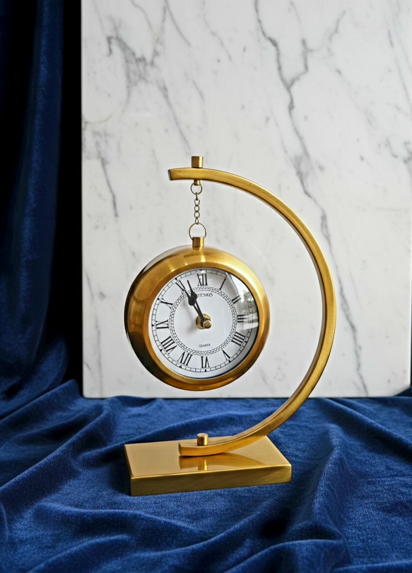 ساعت رومیزی آرتمیس مدل 30260 با طراحی خاص و چشمنواز، انتخابی شیک برای دکوراسیونهای مدرن و کلاسیک است. بدنه فلزی با آبکاری طلایی براق، در کنار طراحی آویزدار ساعت، جلوهای لوکس و متفاوت به فضای منزل یا محل کار شما میبخشد.