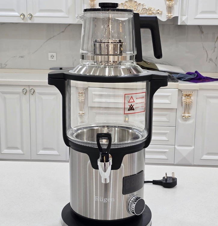 سماور برقی **RUGEN RU1590** با توان **2000 وات** و طراحی ترکیبی **پیرکس و استیل**، انتخابی عالی برای کسانی است که به سرعت، کیفیت و زیبایی اهمیت میدهند. این مدل با قوری شیشهای 1 لیتری و ظرفیت سماور 4.5 لیتری، مناسب استفاده روزمره خانواده و محیط کار است.